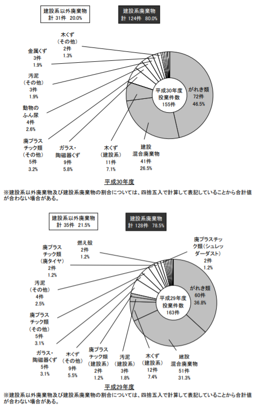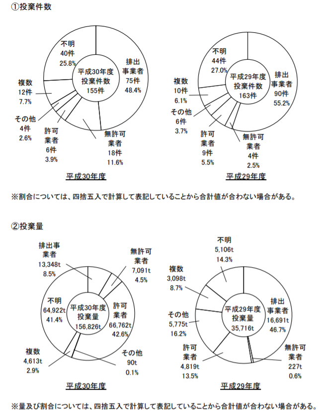 平成30年度は、排出事業者による不法投棄は減少したものの、量・件数ともに無許可業者による不法投棄が増加、許可業者による不法投棄件数は減少したものの不法投棄量は増加するという結果になりました。許可業者による不法投棄の件数減少に対して、量が増加するという傾向から、不法投棄を行った許可業者が1度の不法投棄に対して大量の不法投棄を行ったことが推測されます。