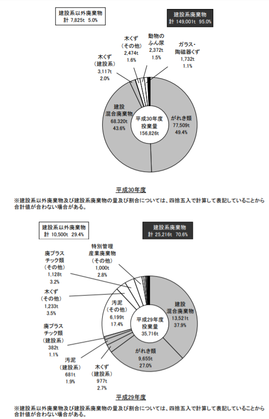 産業廃棄物の種類別統計によると、不法投棄件数・量ともに前年度から、がれき・建設混合廃棄物・木くずの順で多いという結果になっています。しかし、割合を見てみると平成30年度の不法投棄量は、がれき類49.4%、建設混合廃棄物43.6%、木くず(建設系)2%、建設系廃棄物の合計が95%になるなど、前年度と比較して極端にがれきと建設混合廃棄物の量が多く、この2種類が増加したことにより建設系廃棄物も増加したことがわかります。
