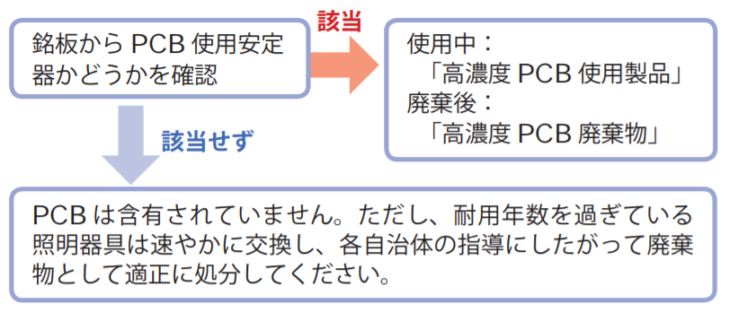 昭和32年1月から昭和47年8月に国内製造された照明器具の安定器は、PCBが使用されたものがあります。しかし、一般家庭用の蛍光灯の安定器にはPCBは使用されていません。