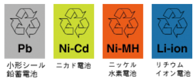 回収・リサイクルが法律で定められている小形二次電池(小形シール鉛蓄電池・ニカド電池・ニッケル水素電池・リチウムイオン電池)