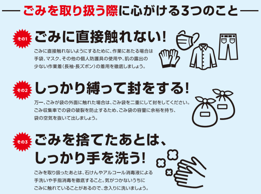 環境省が「新型コロナウイルスなどの感染症対策のためのご家庭でのごみの捨て方~家庭ごみを出すときに心がける5つのこと~」を公開しています。正しいごみ出しルールに従うことで、家族のためだけでなく、ごみの収集・処理を行う作業員の感染対策につながり円滑で安全なごみ収集・処理につながります。