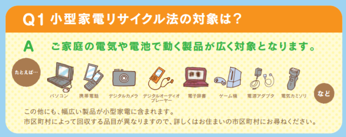 - 小型家電は「小型家電リサイクル法」に従って回収ボックスを設置する市役所や協力小売店などに持って行く