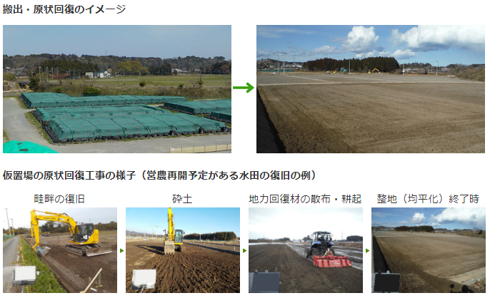 福島県内では仮置場などで一時保管後、中間貯蔵施設や仮設焼却施設へ搬出します。搬出が完了した仮置場は、原状回復※後に地権者へ返地します。