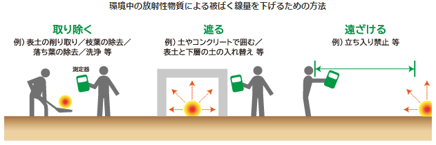 除染とは、人の生活空間で受ける放射線量を減らすため、放射性物質汚染廃棄物から放射性物質を除去したり、土で覆ったり、遠ざけたりすることを言います。