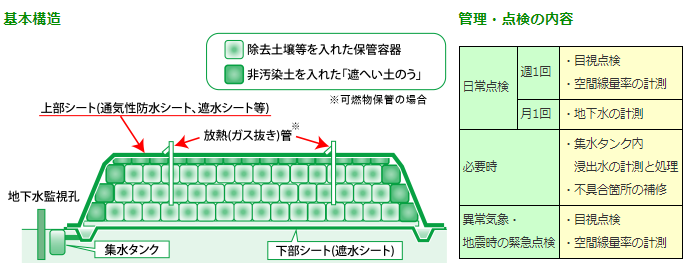 - 除去土壌の飛散・流出を防ぎ、雨水の流入や地下水の汚染を防止するため、雨水を通さない遮水シートや防水シートの上に、除去土壌を入れたフレキシブルコンテナや大型土のうを置き、さらにその上を防水シートなどで覆います