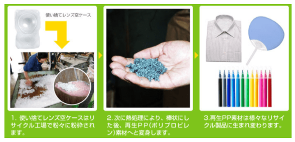 また、コンタクトレンズが入っていた空ケース(ブリスターケース)は、ポリプロピレンという素材で作られ、非常にリサイクルに適していることから、自治体によるプラスチック容器としての回収だけでなく、各企業でも回収・リサイクルする取り組みが行われています。