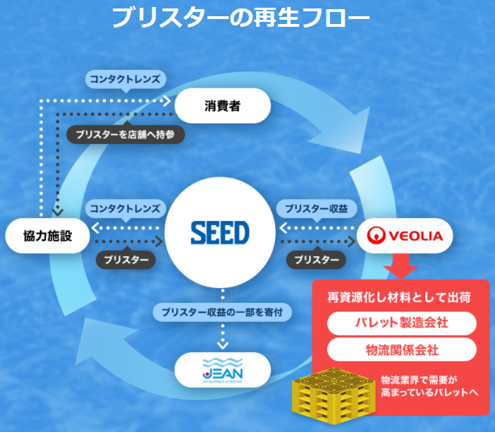 株式会社シードでは、眼科・コンタクトレンズ販売店などで空ケースの回収を行っています。回収した空ケースをヴェオリア・ジャパンが購入し、空ケースは物流のプラスチックパレットに生まれ変わります。