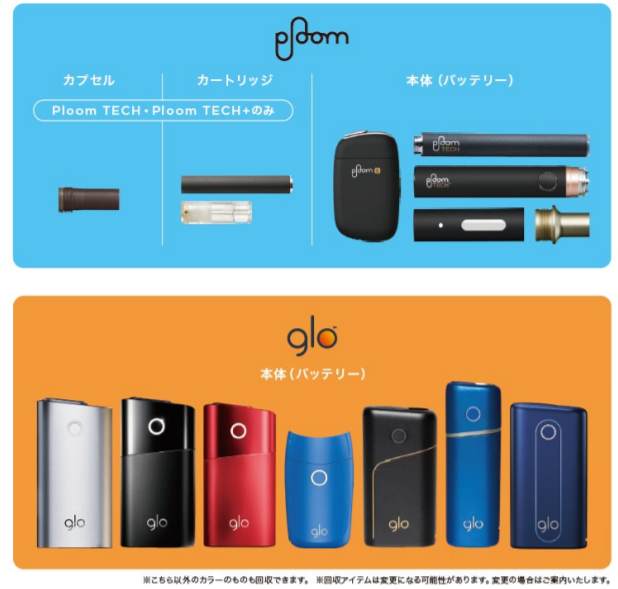 現在、一般社団法人日本たばこ協会ブリティッシュ・アメリカン・タバコ合同会社日本たばこ産業株式会社によって、加熱式たばこ機器である「glo」や「Ploom」各種の使用済み本体と一部の消耗品を対象としたリサイクル事業が行われています。