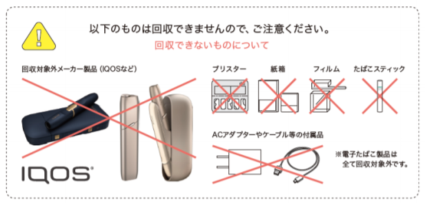 「IQOS (アイコス)」等の回収対象外のメーカー製品やその付属品、電子たばこは全て回収対象外となります。